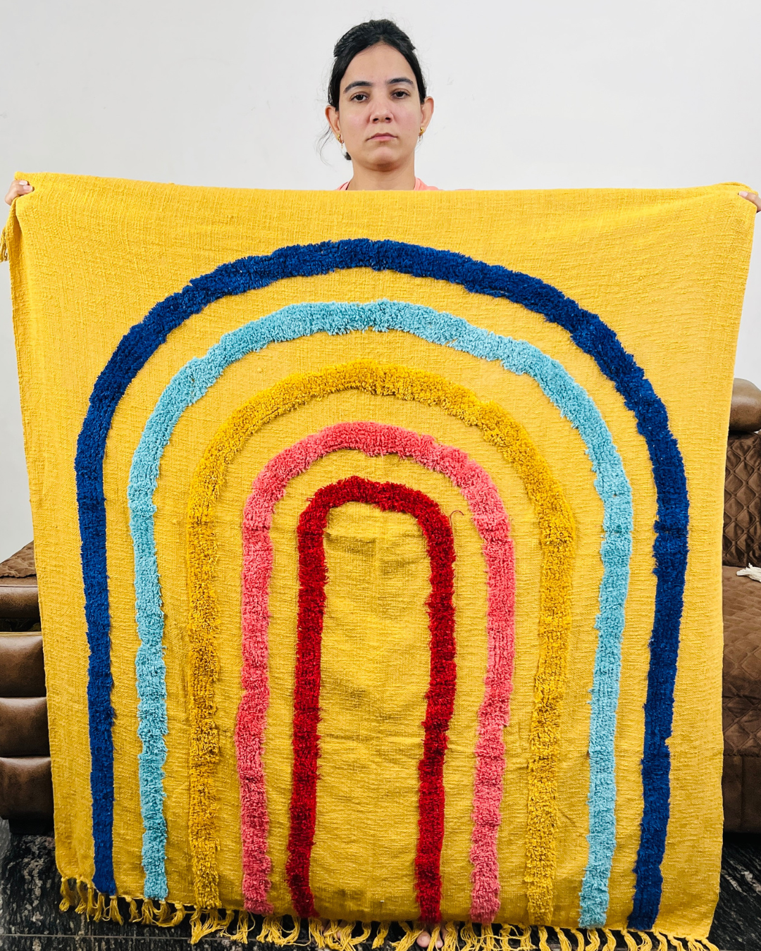 Brighten up your living room with this vibrant 🌈 Premium 3D Tufted Rainbow Sofa Throw, crafted from soft and durable slub cotton fabric. The colorful rainbow arcs add an instant pop of joy to your space, while the textured hand-tufted design gives a rich, premium feel. Finished with tassel fringes, this throw perfectly blends comfort, style, and playful charm.